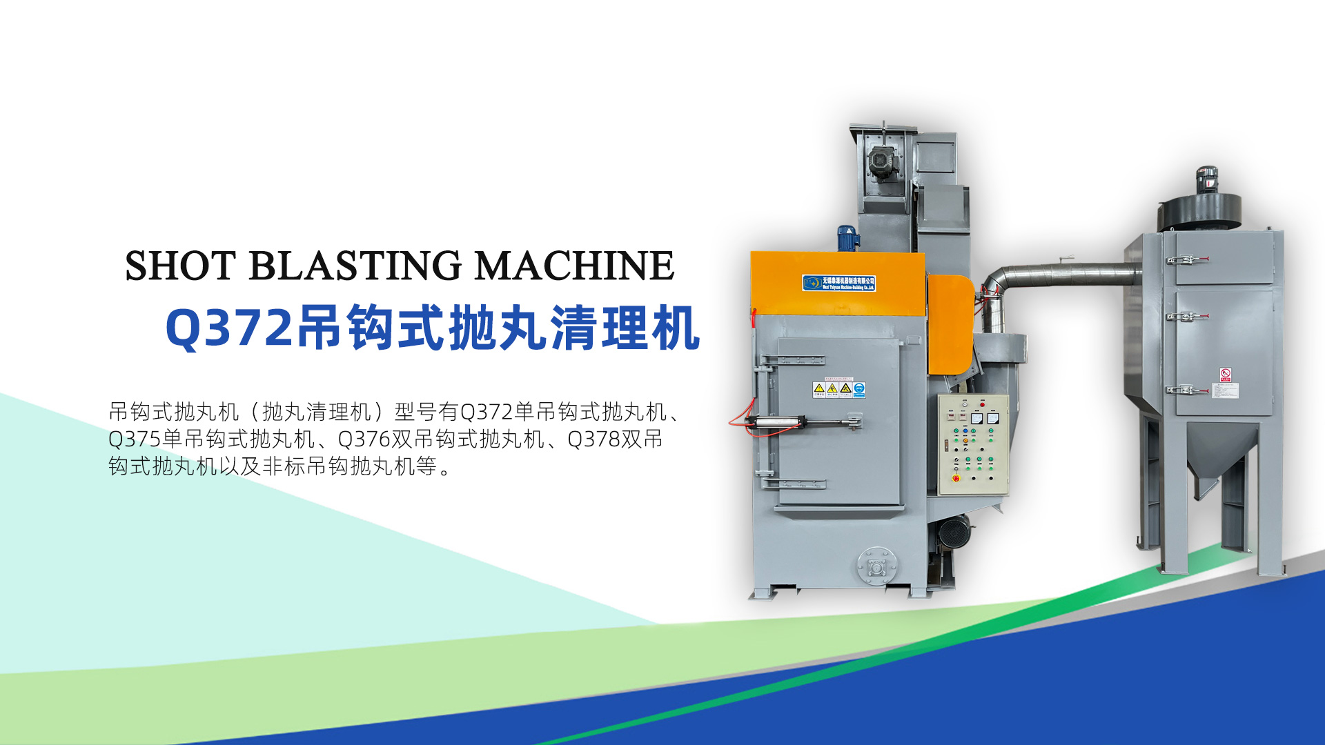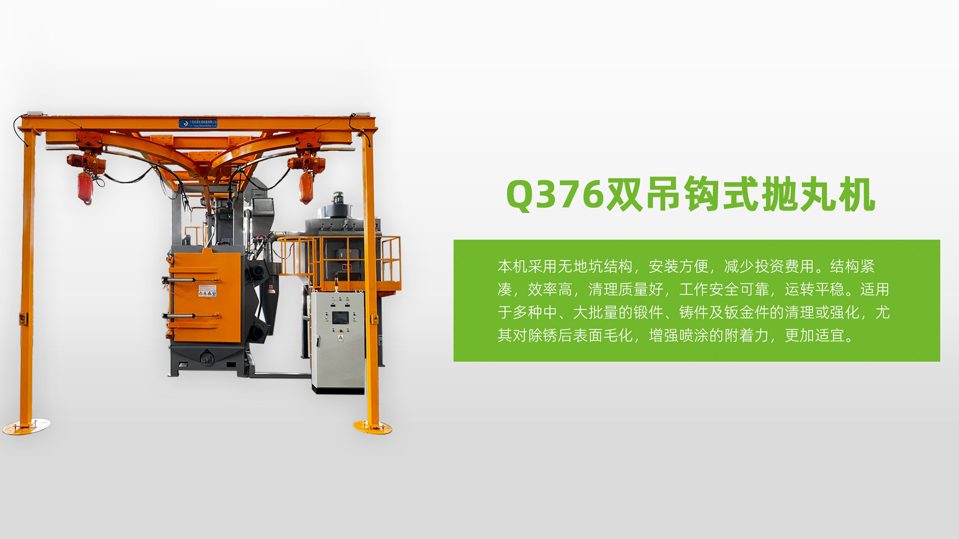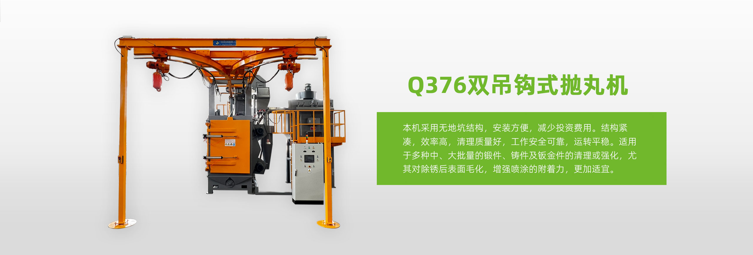 本机采用无地坑结构,安装方便,减少投资费用。 2、 结构紧凑,效率高,清理质量好,工作安全可靠,运转平稳。 3、 清理室采用高铬锰板,耐磨耐冲击,强度好。 4、 双吊钩结构,彼此独立工作,互不影响,提高生产效率,吊具采用行星原理,自转公转同时进行,处理后的工件不存在阴阳面。 5、 二级除尘(旋风除尘,布筒过滤器),吸风量大,灰尘过滤干净,空气排放符合环保标准。 6、 装配严谨,优质轴承、电机运转噪音底。