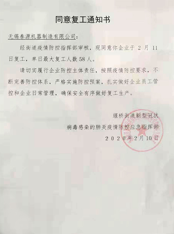经过公司领导的不懈努力,公司成为园区第一批可以复工的企业,于2020年2月12日正式复工生产。虽然因这次肺炎疫情,公司只能够部分人员暂时先复工,但是公司将急客户之所急,想客户之所想,众志成城,共克难关,保质保量按时完成生产任务,及时为客户发货。